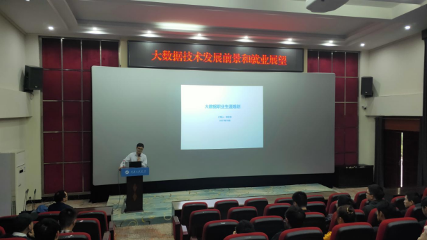 讲座钟总工通过企业具体职责和工作内容以及岗位要求展开。主要涉及大数据发展、大数据背景、大数据平台的总体架构以及重庆公司大数据建设等方面。他通过详实数据、图表分析给在场师生分析了大数据面临的新机遇与挑战,同时为大数据学生分享了学习经验和今后努力方向。