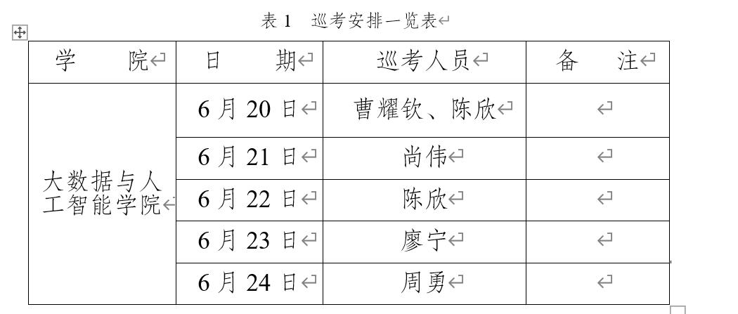 (一)巡考职责:对考试工作提出指导意见,检查考试工作的执行情况,就考试过程中存在的问题提出意见和建议,填写《重庆工程学院课程考试巡考记录表》。巡考安排如下: