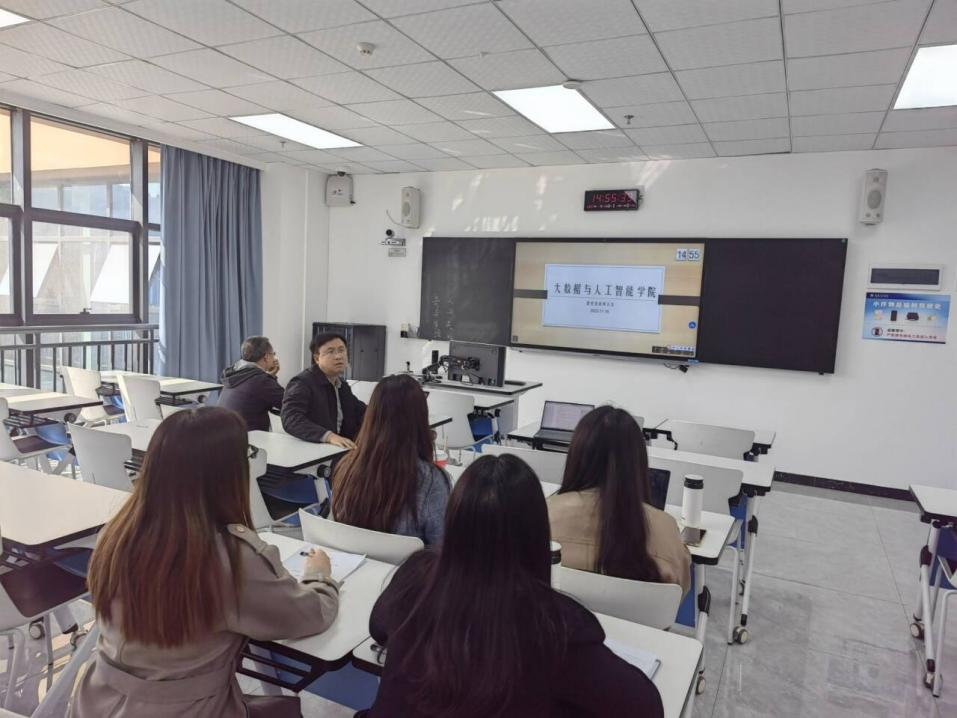 本网讯(文/图 大数据与人工智能学院 廖宁)11月16日下午,大数据与人工智能学院在7206教室举行了一场精彩的课程思政研讨会。该研讨会旨在促进校级课程思政示范课程的申报和建设工作。柏森教授、廖宁副院长、周勇院长助理以及四名参与示范课程申报和建设的老师齐聚一堂,共同探讨和分享有关思政课程的经验和心得。