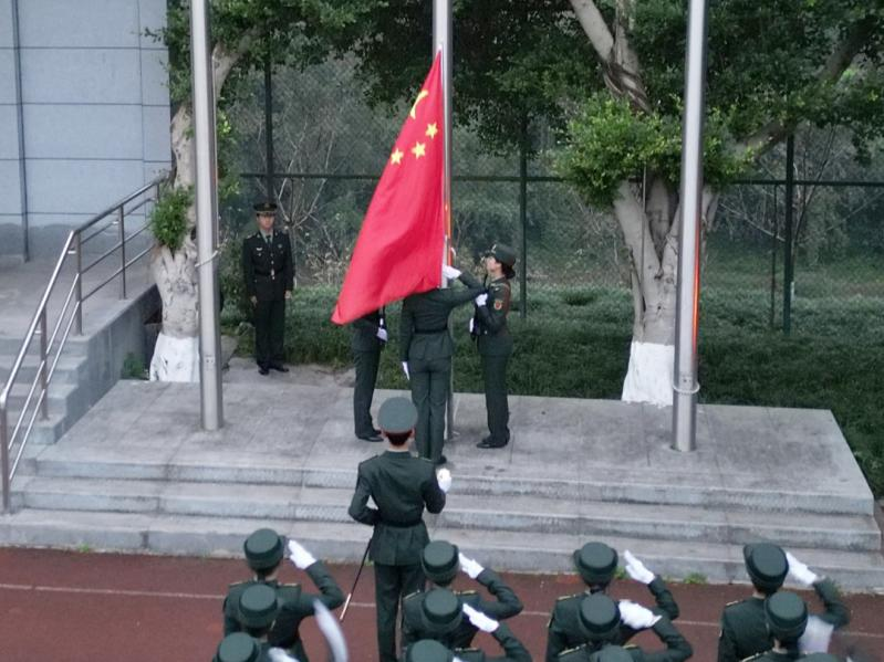 仪式开始,国旗护卫队脚步声整齐划一,步步铿锵!五星红旗在嘹亮的国歌声中冉冉升起,迎风飘扬。