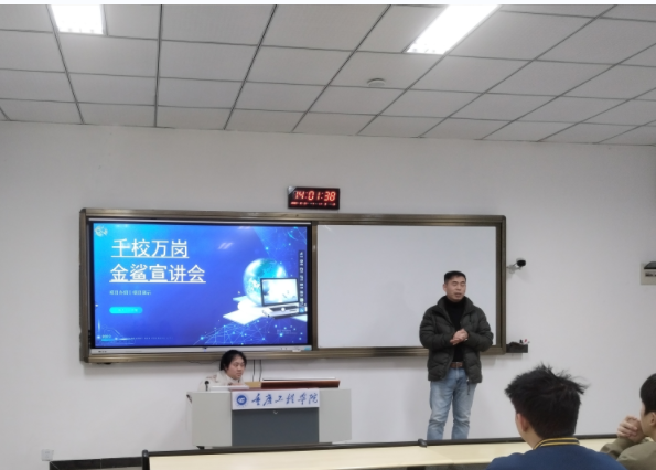 本场招聘会邀请到重庆金鲨信息科技有限公司的邓总莅临现场,他向在场学生们对企业文化、企业部分项目情况进行了介绍。金鲨信息本次招聘主要招聘AIGC提示词工程师,其需求与我院专业非常吻合。邓总对该岗位的能力需求、岗位职责等进行了详细的讲解,该岗位主要负责AIGC+图像的提示词研究,优化生图效率和质量,持续迭代AI绘图模型,并能够在云端部署模型与调试。他还在现场展示了公司的一些产品,如数字人直播、十二生肖、京东带货、网红秀等,并解释了这些产品的技术需求和应用场景。