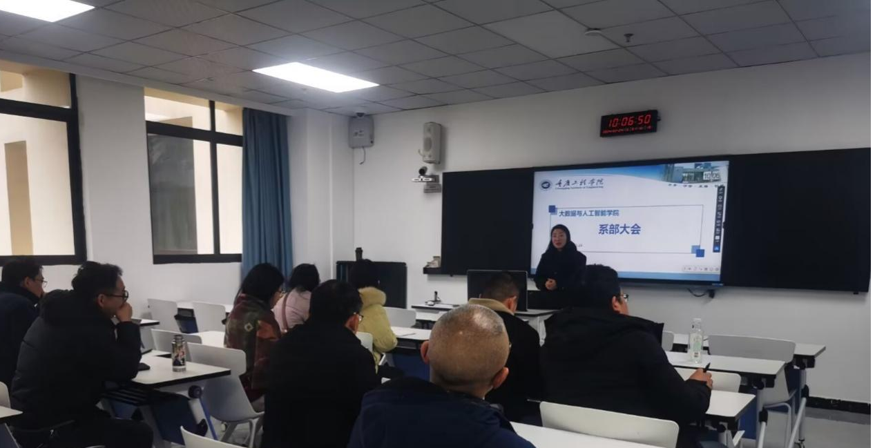 (本网讯 大数据与人工智能学院 大数据系)2024年2月24日上午10点,大数据与人工智能学院大数据系在七教307举行了本学期的首次系部工作会议。此次会议由系主任陈欣主持,全系教师参加,旨在确保新学期教学任务的顺利开展和课程质量的持续提升。会议的核心议题围绕期初教学任务的安排和各课程组的说课展开。