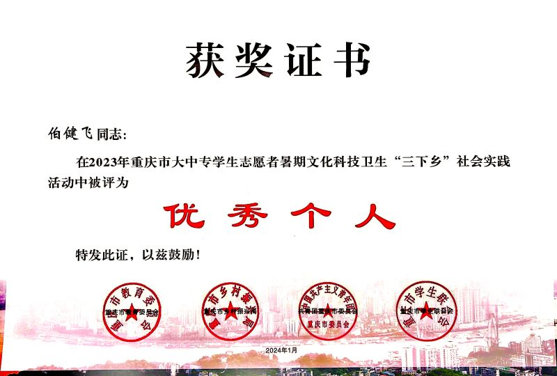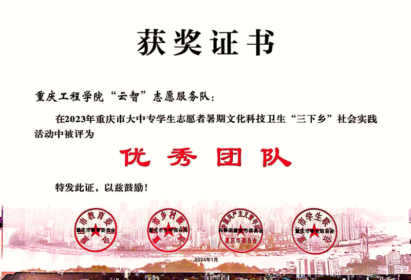 本网讯(图/文 大数据与人工智能学院 辜虹蕊)近日,重庆团市委公布了《关于2023年重庆市大中专学生志愿者暑期文化科技卫生“三下乡”社会实践活动优秀集体和个人的通报》,重庆工程学院“云智”志愿服务队,在大数据与人工智能学院分团委书记王惠俊指导下,凭借其出色表现,荣获优秀团队荣誉称号,领队伯健飞荣获优秀个人荣誉称号。