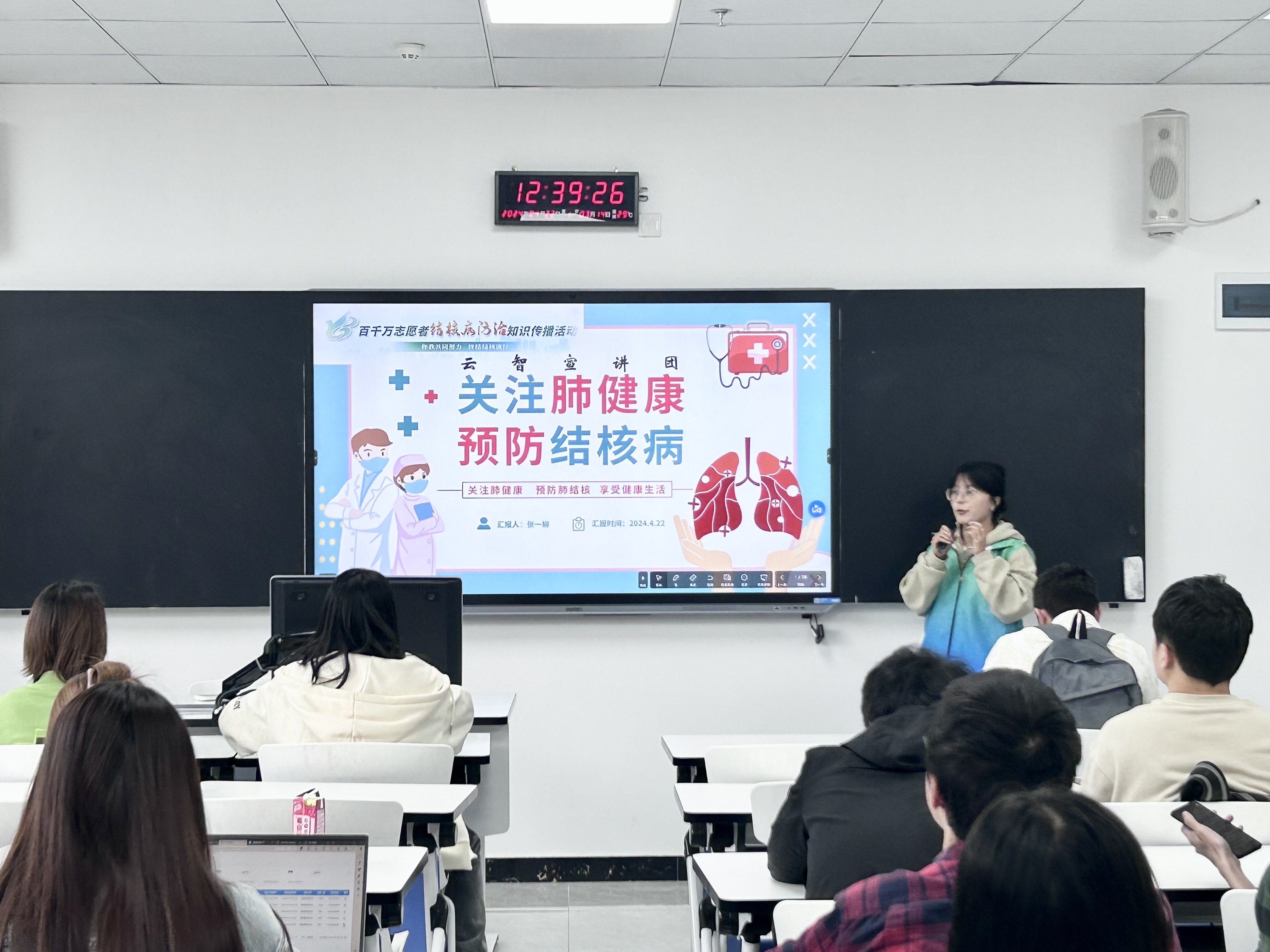 本网讯(图/文 大数据与人工智能学院 辜虹蕊 孙洪萍)为增强学生健康意识,提高大家对结核病的认识和预防意识,助力实现全民健康目标,2024年4月22日,云智志愿服务队云智宣讲团在7108教室开展主题为“关注肺健康 预防结核病”主题宣讲进班级团日活动。