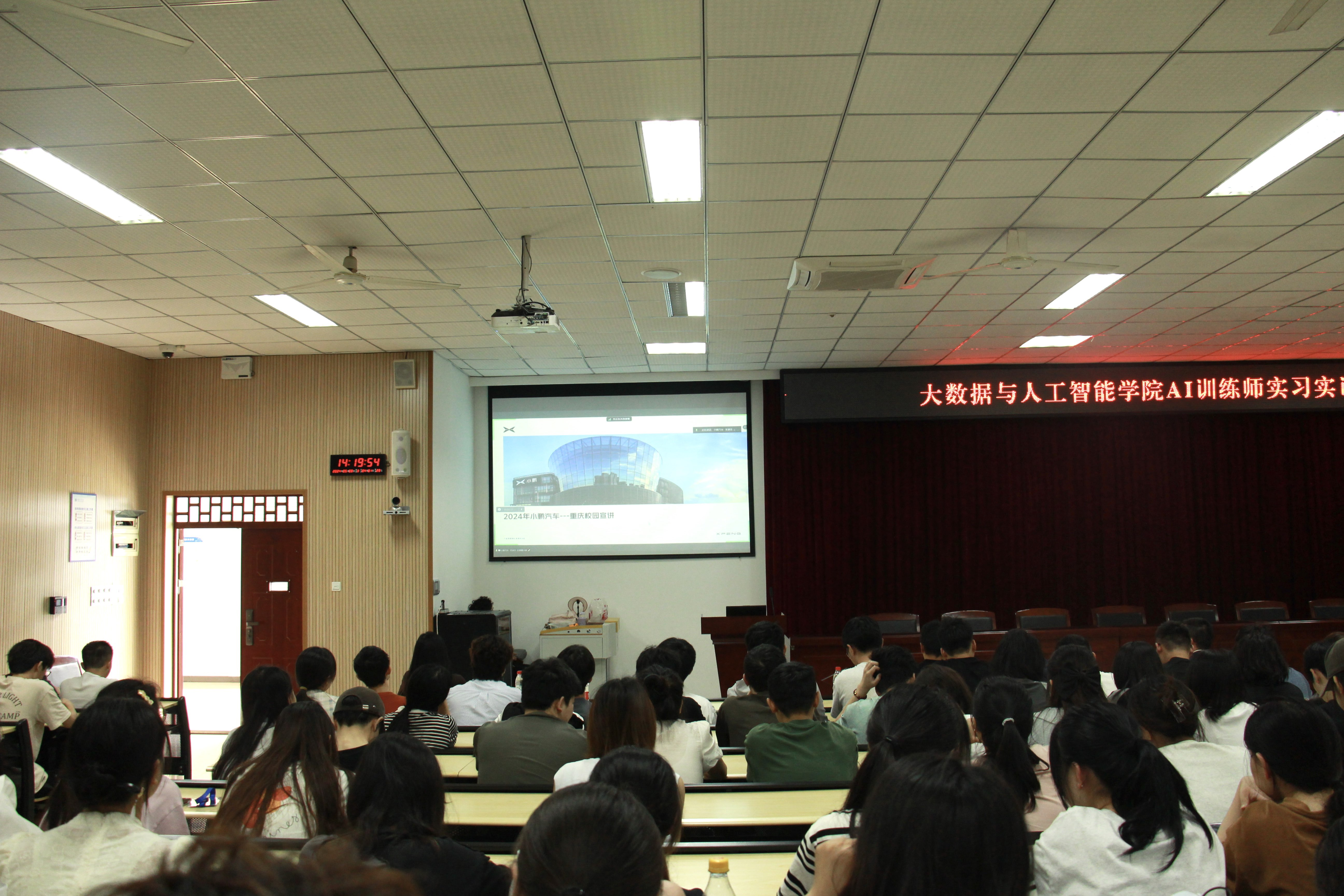 (文/图 大数据与人工智能学院 敬夫)为进一步深化“校企合作、产教融合”的人才培养模式,提升学院学生就业竞争力。5月8日,大数据与人工智能学院在6302报告厅举行了“小鹏汽车AI工程师实习实训项目专场招聘会”,学院院长李钦、党总支副书记宁俊龙、副院长吴平、学生科副科长王惠俊以及相关辅导员参会,此次会议特别邀请小鹏汽车数据标注负责人李总担任宣讲嘉宾,吸引了210余名同学共同参与。