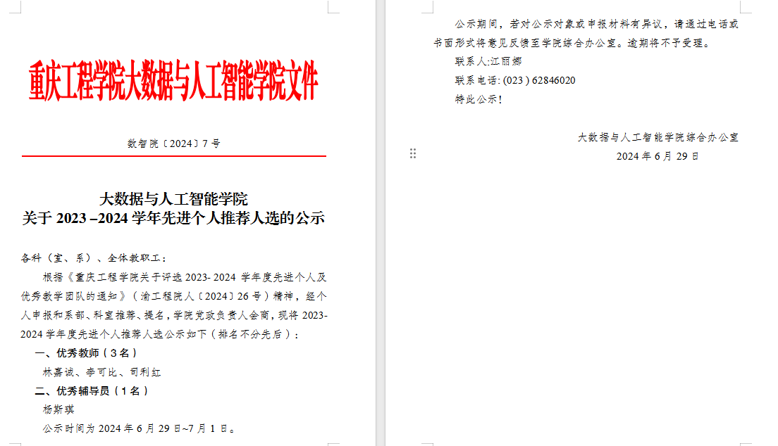 大数据与人工智能学院关于2023 -2024学年先进个人推荐人选的公示