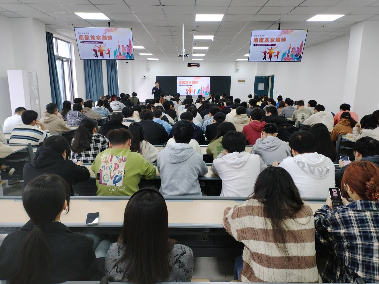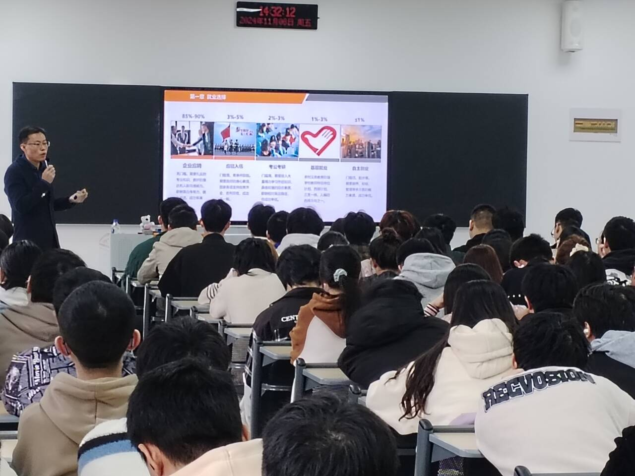 本网讯(文/图 敬夫)为了提升我院专升本学生的行业认知,促进专升本同学的就业认识。11月8日,大数据与人工智能学院党总支副书记宁俊龙和就业科敬夫一起前往双桥校区对26届专升本学生做“启航领水湖畔”就业指导讲座。我院26级全体专升本同学参会。