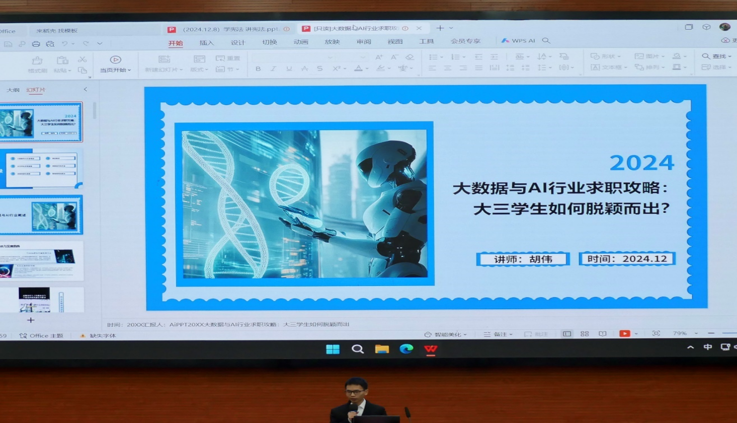 本网讯(文/图 敬夫)2024年12月8日,大数据与人工智能学院开展“大数据与AI行业求职攻略——大三学生如同脱颖而出”主题讲座,特邀重庆市继续教育学会师谈培训专委会主任胡伟老师主讲,我院大三全体学生参会。