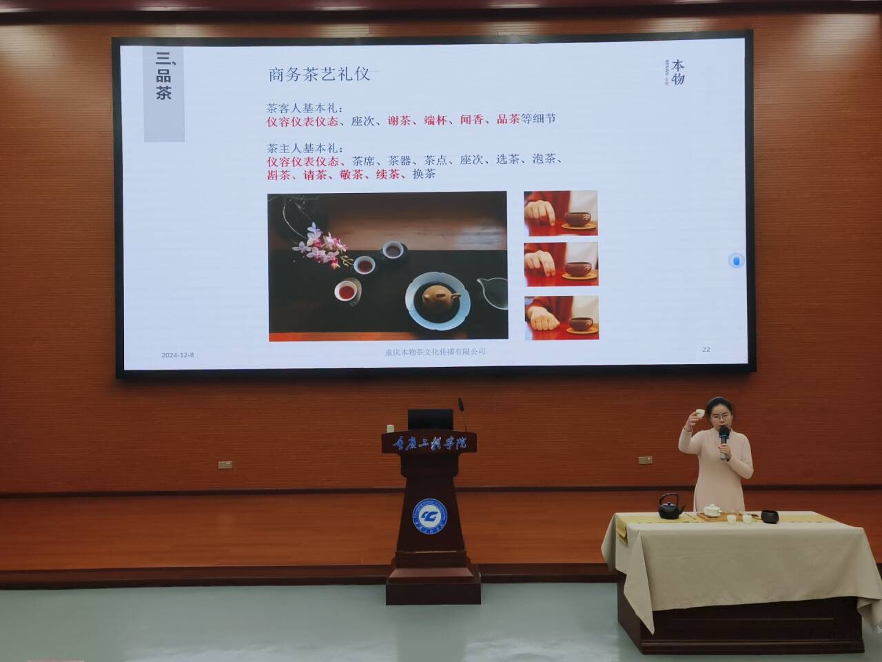 本网讯(文/图 大数据与人工智能学院 郭梁东 汤越)12月8日,大数据与人工智能学院在7807开展了“茶韵悠长:探索中国茶文化的深厚底蕴”主题讲座。国家一级茶艺师冯霞老师作为主讲人,学院大二年级全体学生共同参与。