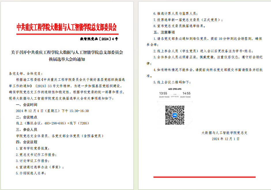 关于召开中共重庆工程学院大数据与人工智能学院总支部委员会换届选举大会的通知