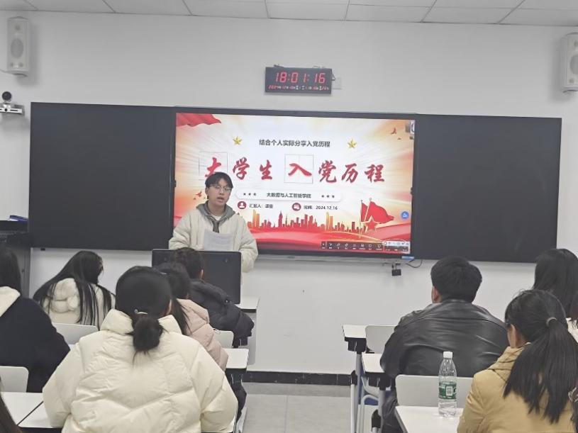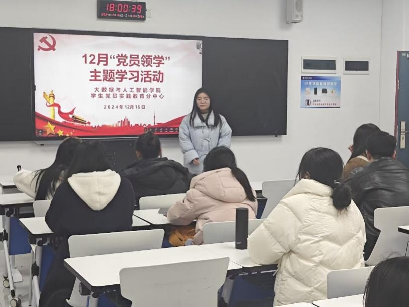 本网讯(文 邹明娟 / 图 张肖麟)为深入提升党员理论学习质量,增强党员学习意识,丰富学习形式,提高学生党员党建理论水平和个人素质,大数据与人工智能学院学生党员实践教育分中心于2024年12月16日18:00,在第七教学楼7105室组织开展了“党员领学”主题学习活动。