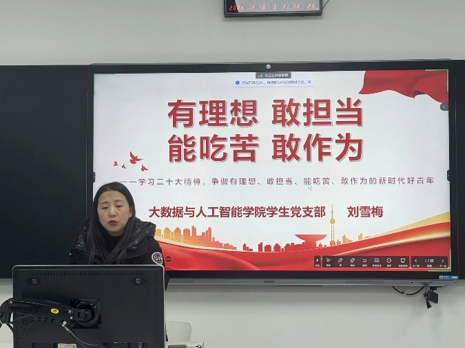 本网讯(图 谭童/文 施后纳)为进一步提高学生党员的理论素养和实践能力,探讨如何在学习、工作和生活中发挥党员的先锋模范作用,敢担当、敢作为,大数据与人工智能学院学生党支部于12月18日在7206组织开展“有理想 敢担当 能吃苦 敢作为”书记上课活动。此次党课由学生党支部书记刘雪梅主持,支部全体党员参与。