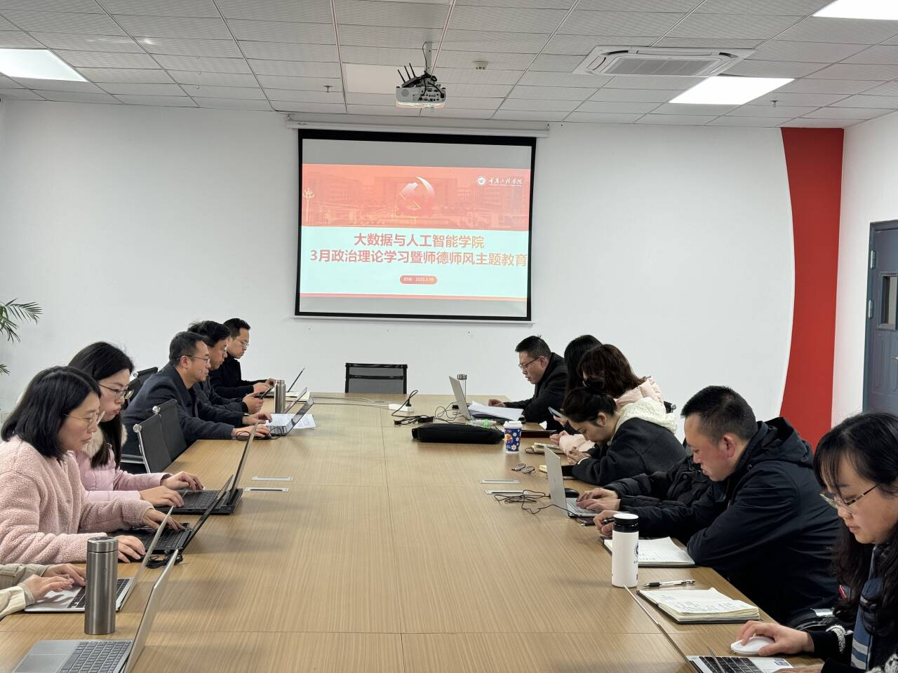 本网讯(文/图 杨孟凡)3月19日下午,大数据与人工智能学院于7205召开了政治理论学习与师德师风建设主题教育会议,全体教职工参会。此次会议以“强化教育支撑作用,深化育人实践”为核心主题,通过理论学习、政策解读和心得交流三个环节,推动教职工思想建设与业务发展深度融合。