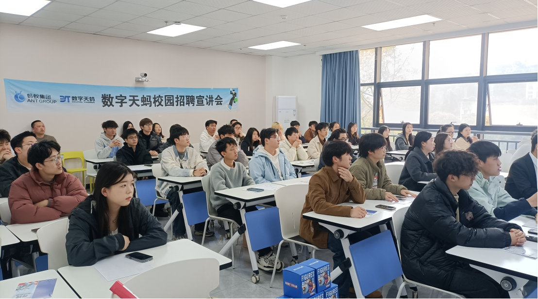 公司人力资源总监楚唐做现场宣讲,他讲述了公司的基本情况:数字天蚂(重庆)信息技术有限公司是蚂蚁集团的全资子公司,公司成立于2024年,主要负责集团金融板块业务,目前重庆公司正在飞速发展,已有200人的规模,本次招聘公司带来花呗、借呗审核员岗位50个,今后主要往大模型和数字化方向培养。之后,公司业务部和信贷部回答了学生关切的问题。最后,公司人员对线下投递简历的50余名同学进行了现场面试,线上参加的同学则另行安排面试时间。