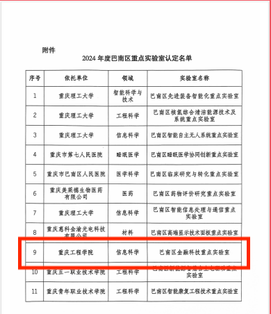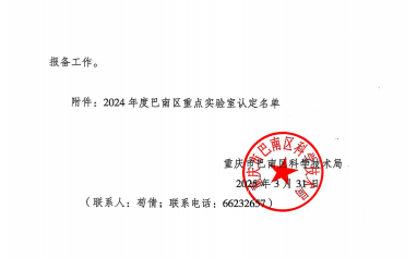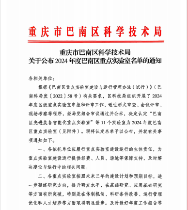 (本网讯/文 图 杨孟凡)近日,重庆市巴南区学科技术局下发《重庆市巴南区科学技术局关于公布2024年度巴南区重点实验室名单的通知》,区科技局通过形式审查、会议评审、现场考察等评审工作,局党组会审议通过并公示,决定认定我院“巴南区金融科技重点实验室”为2024年度巴南区重点实验室。