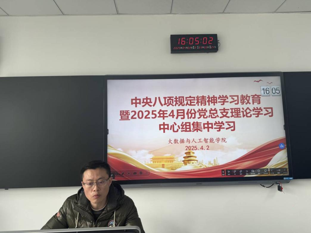 本网讯(图/文 杨孟凡)为深化中央八项规定精神学习,4月2日星期三下午,大数据与人工智能学院全体党员于党政联席会议室(7205)组织开展了专题理论学习活动。