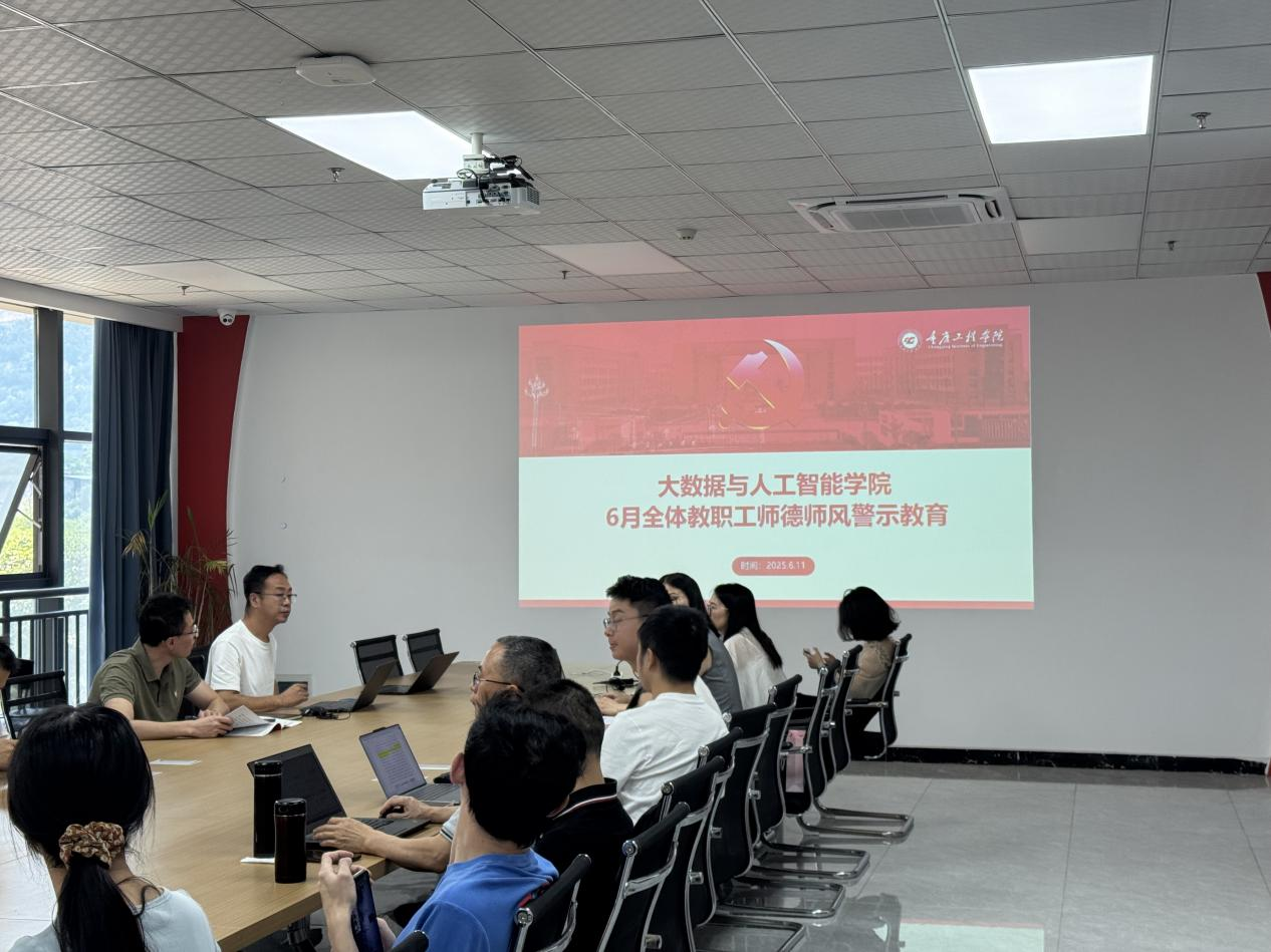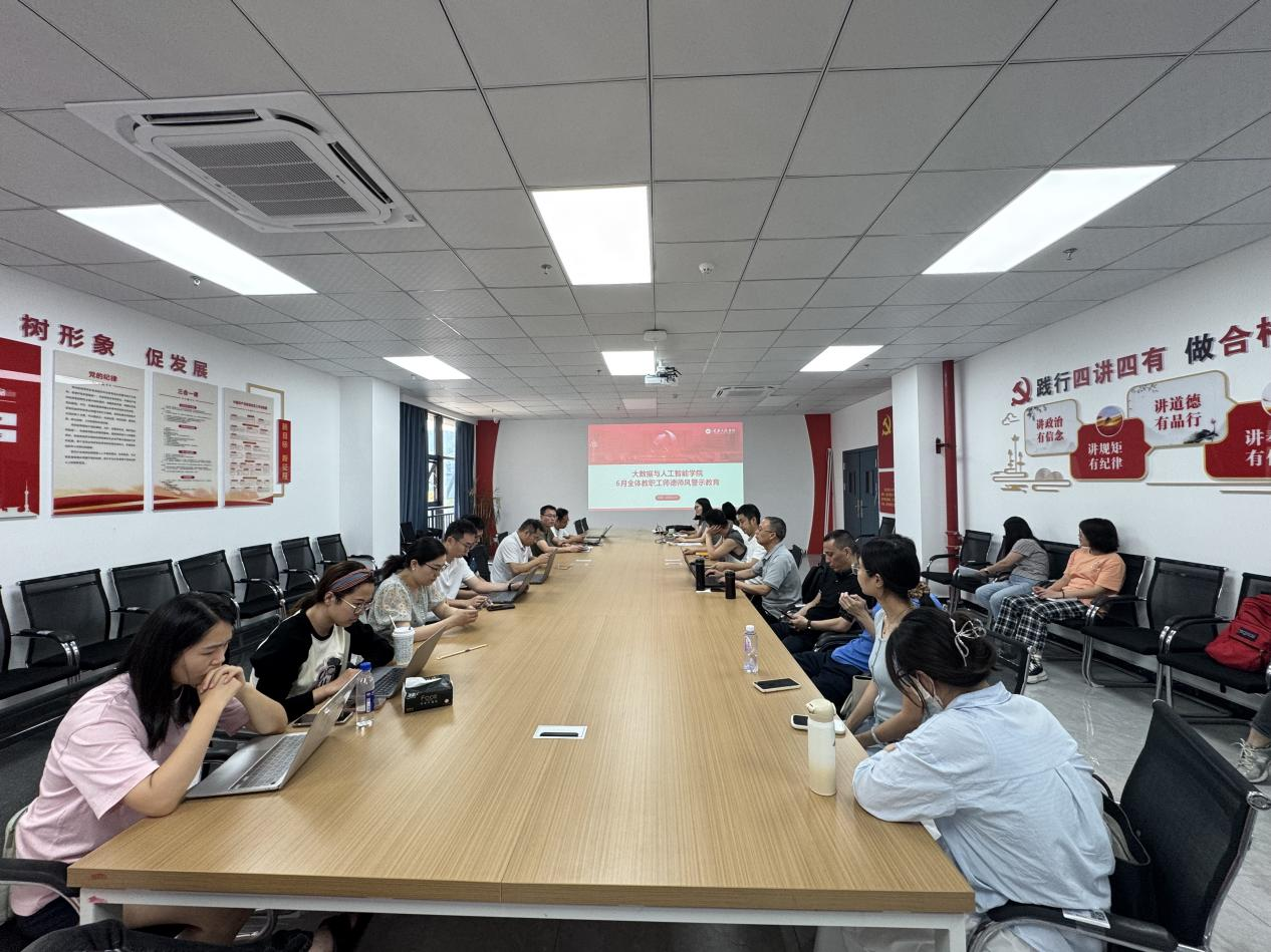 本网讯(文/图 大数据与人工智能学院 杨孟凡)为深入贯彻国家关于加强师德师风建设的重要指示精神,全面提升教师队伍职业道德素养,营造优良的教育教学环境,推动学院教育事业迈向新高度,6月18日13:00,大数据与人工智能学院在党政会议室(7205)精心组织开展了6月份师德师风专题教育活动,学院中心组全体成员积极参与。