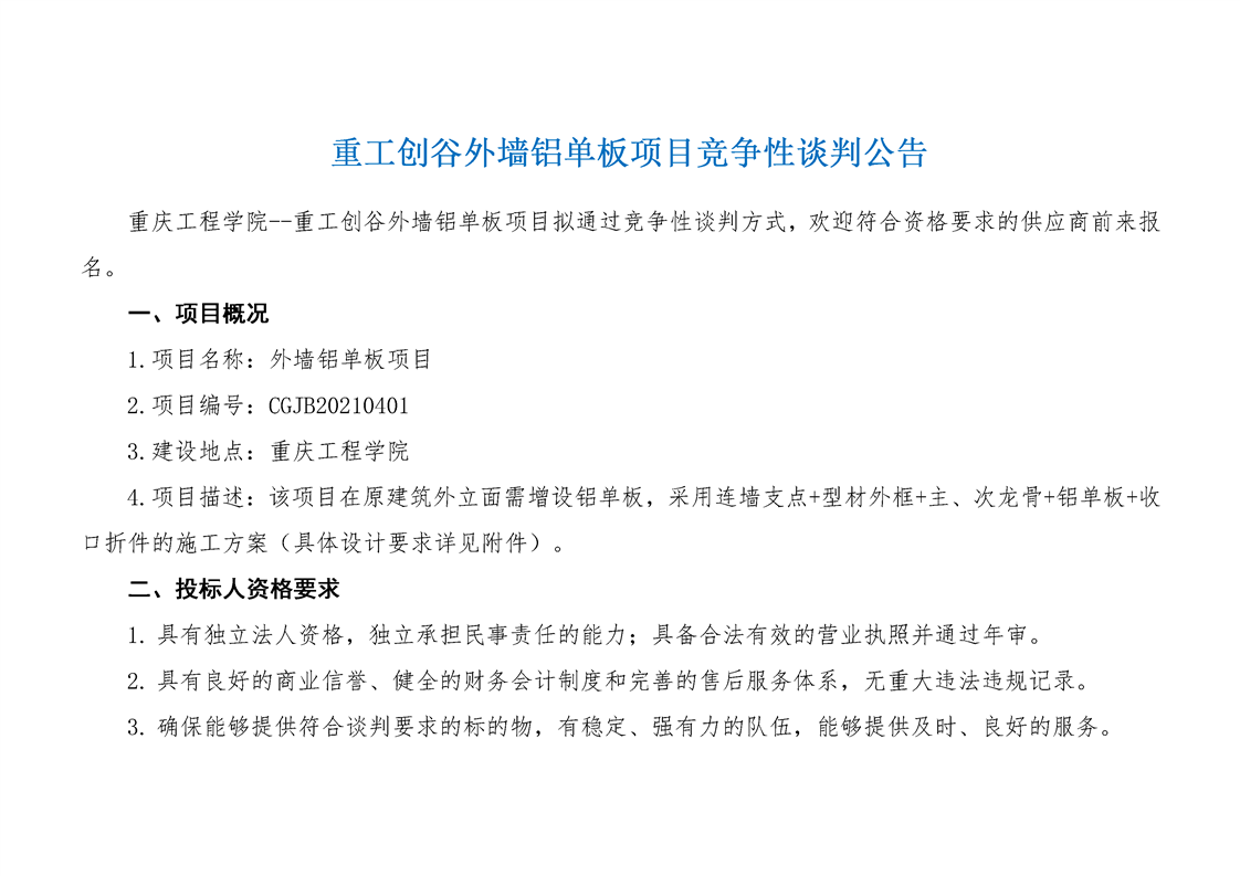 重工创谷外墙铝单板项目竞争性谈判公告