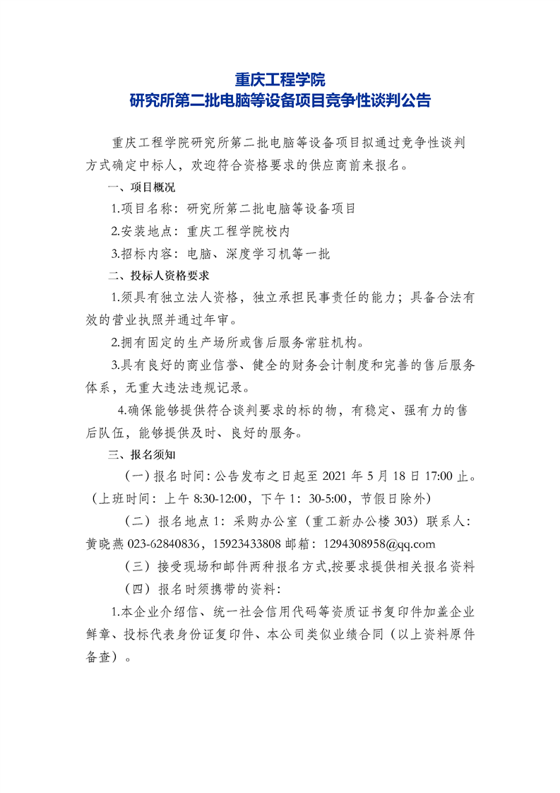 研究所第二批电脑等设备项目竞争性谈判公告
