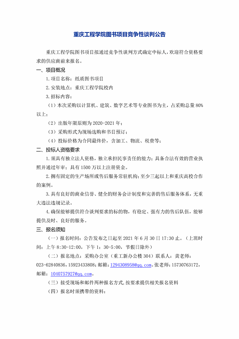 重庆工程学院图书项目竞争性谈判公告