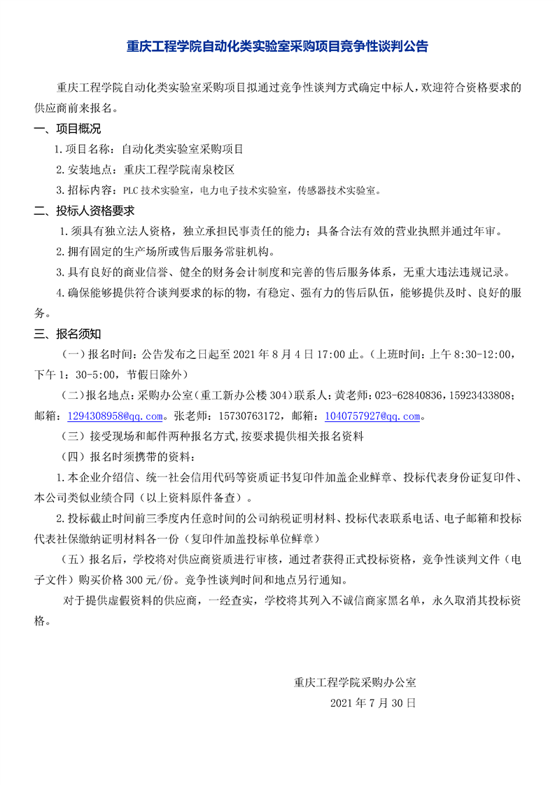 重庆工程学院自动化类实验室采购项目竞争性谈判公告