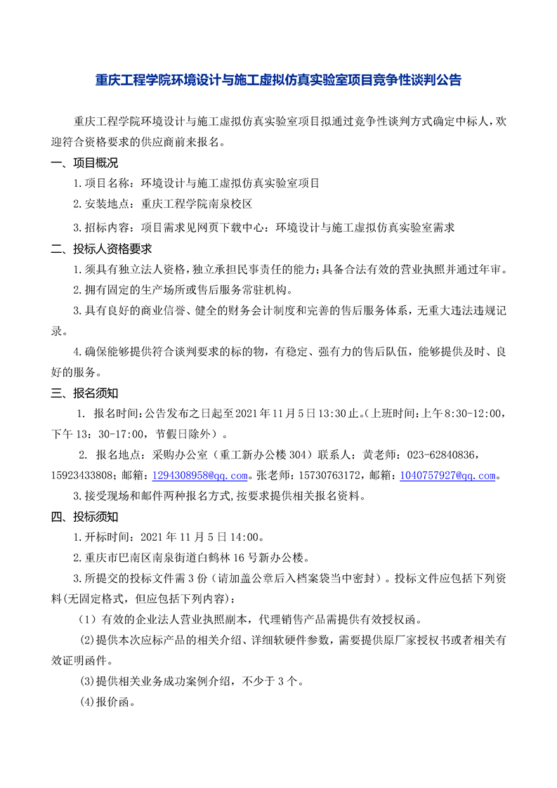 重庆工程学院环境设计与施工虚拟仿真实验室采购项目竞争性谈判公告
