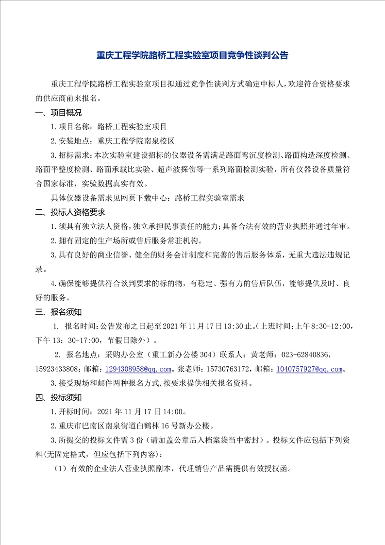 重庆工程学院路桥工程实验室项目竞争性谈判公告