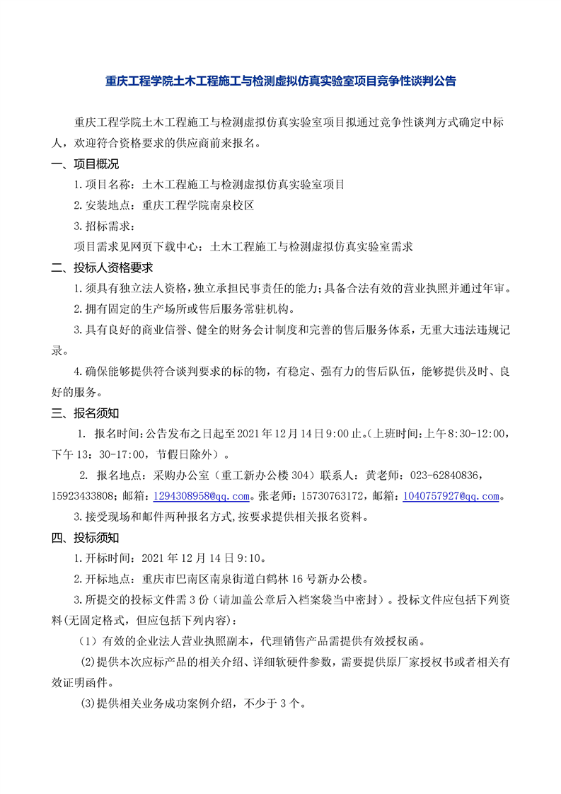 重庆工程学院土木工程施工与检测虚拟仿真实验室采购项目竞争性谈判公告