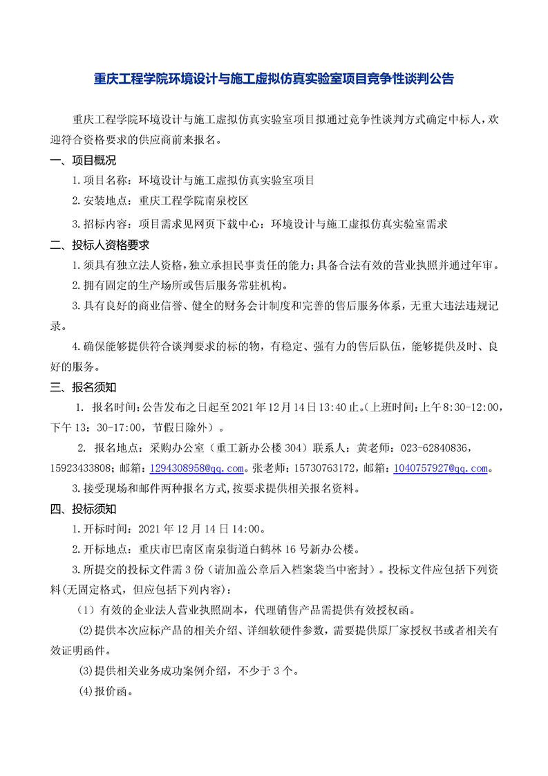 重庆工程学院环境设计与施工虚拟仿真实验室采购项目竞争性谈判公告
