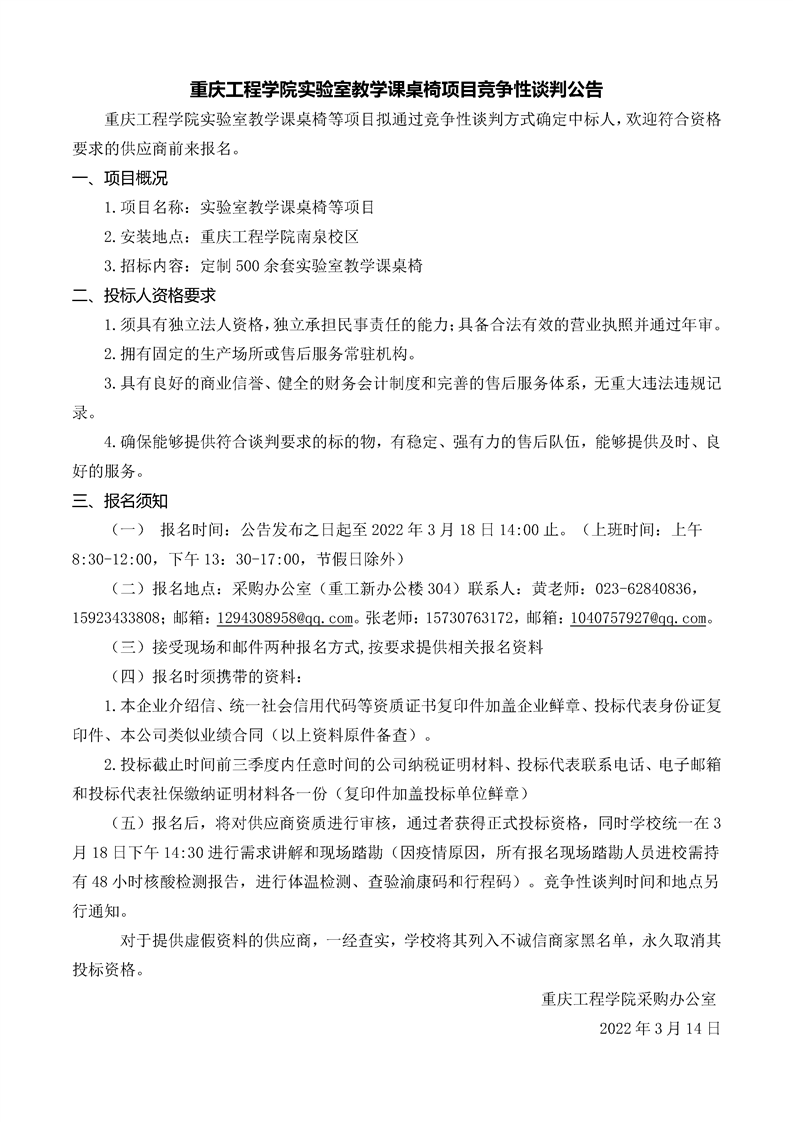 重庆工程学院实验室教学课桌椅采购项目竞争性谈判公告