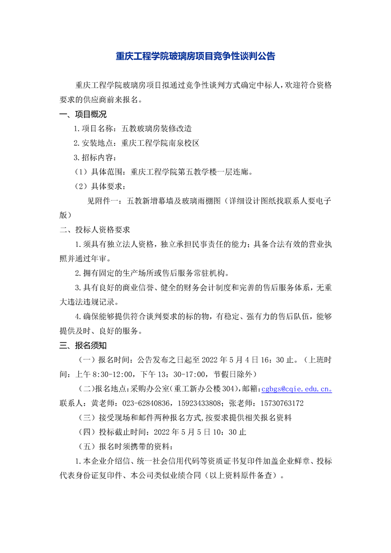 重庆工程学院玻璃房项目竞争性谈判公告