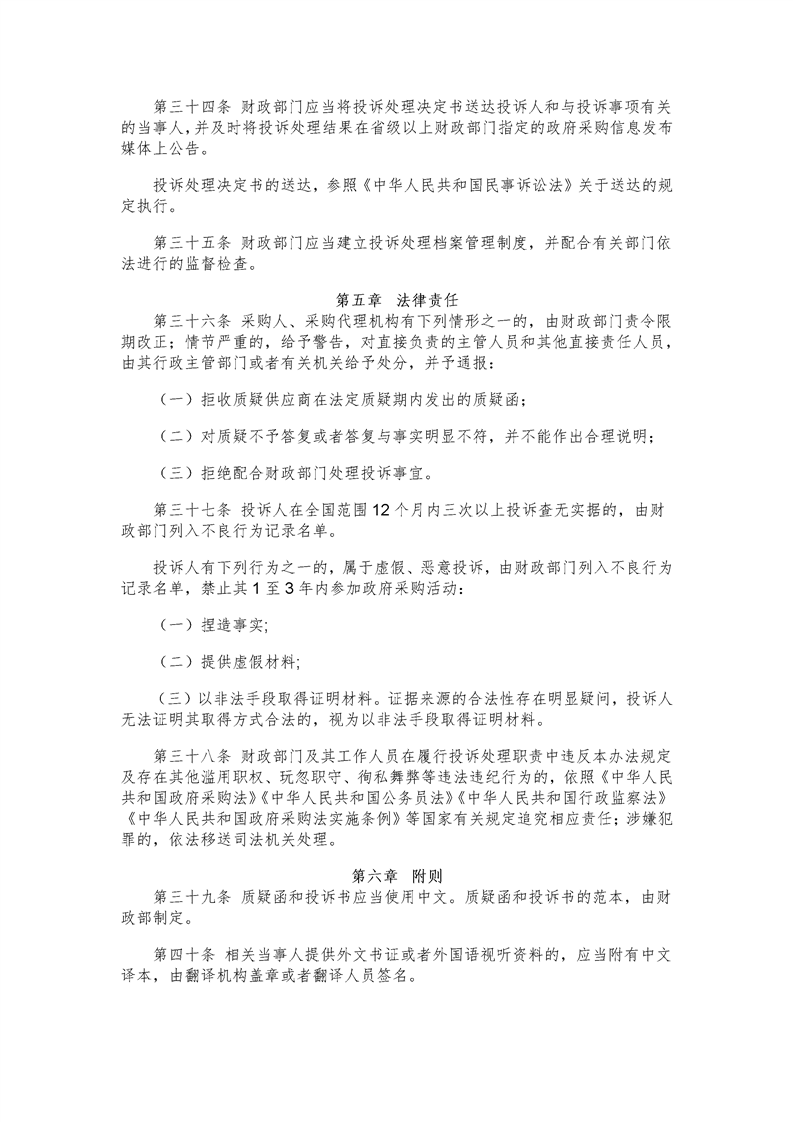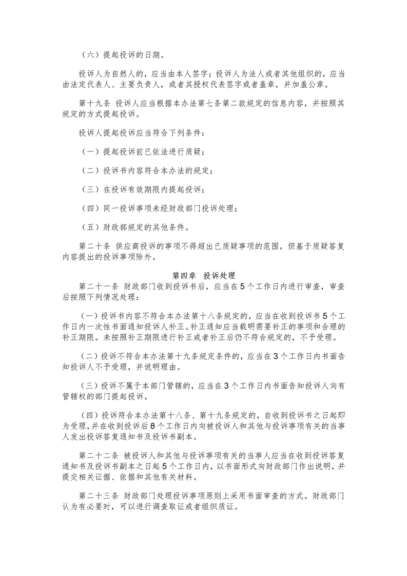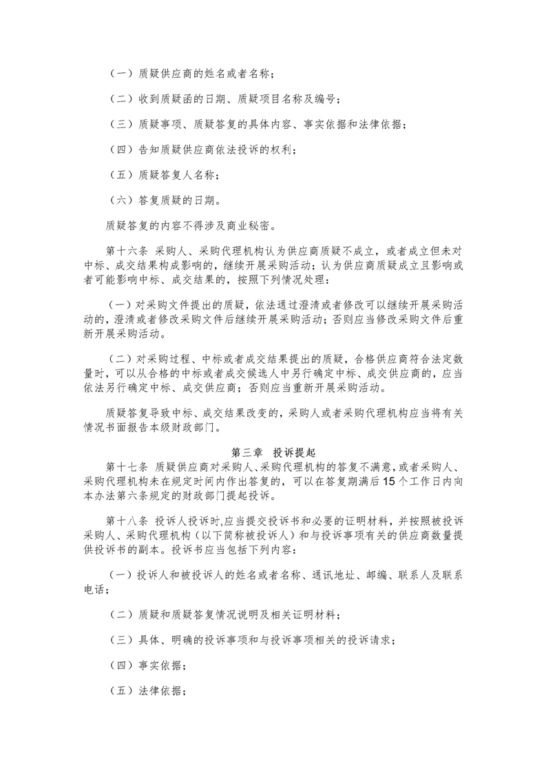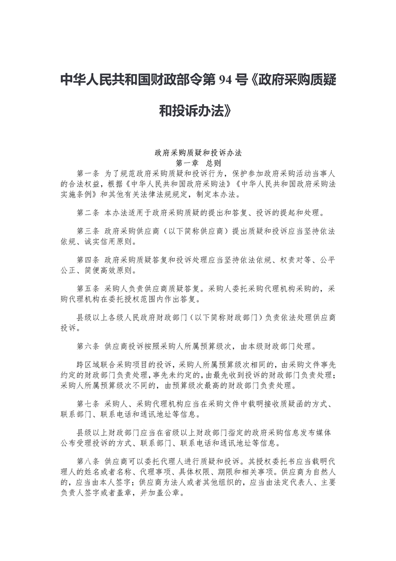 中华人民共和国财政部令第94号《政府采购质疑和投诉办法》