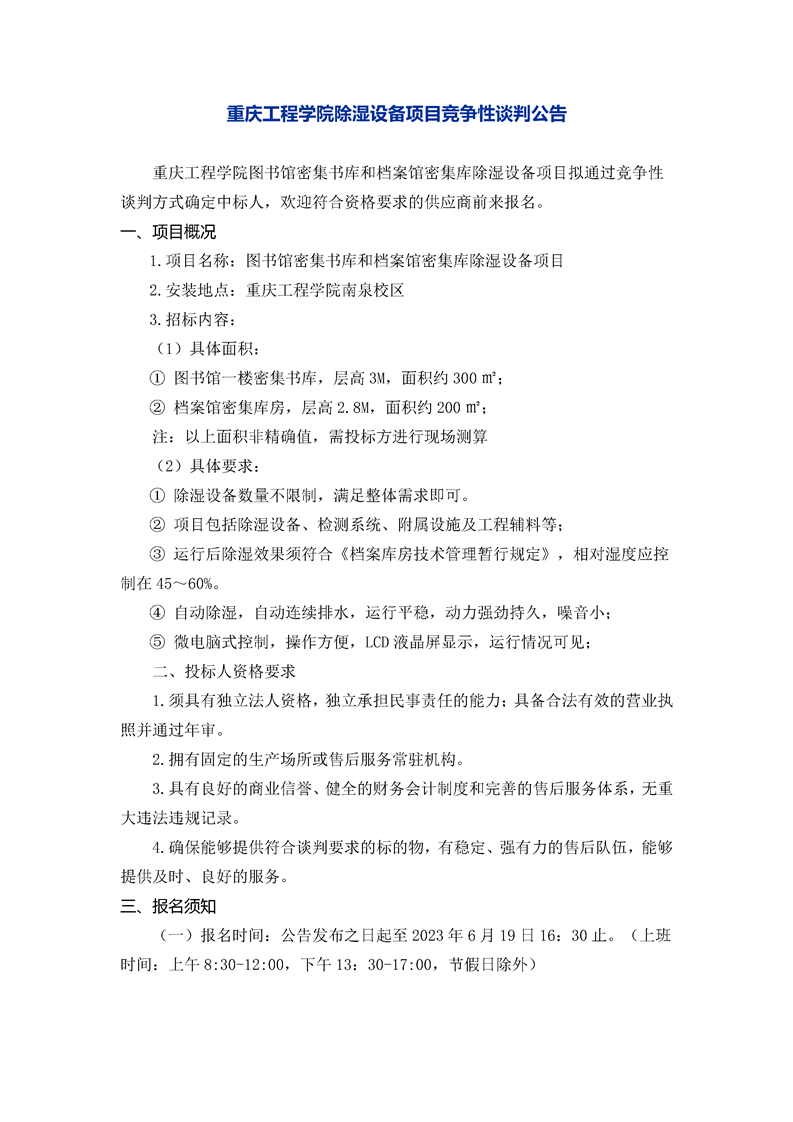 重庆工程学院除湿设备项目竞争性谈判公告