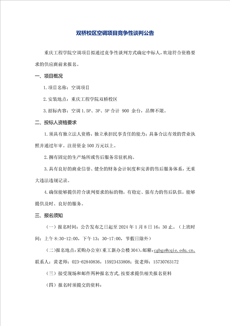 重庆工程学院双桥校区空调项目竞争性谈判公告