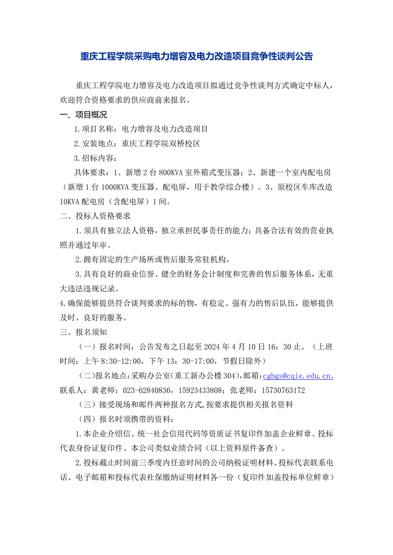 重庆工程学院采购电力增容及电力改造项目竞争性谈判公告