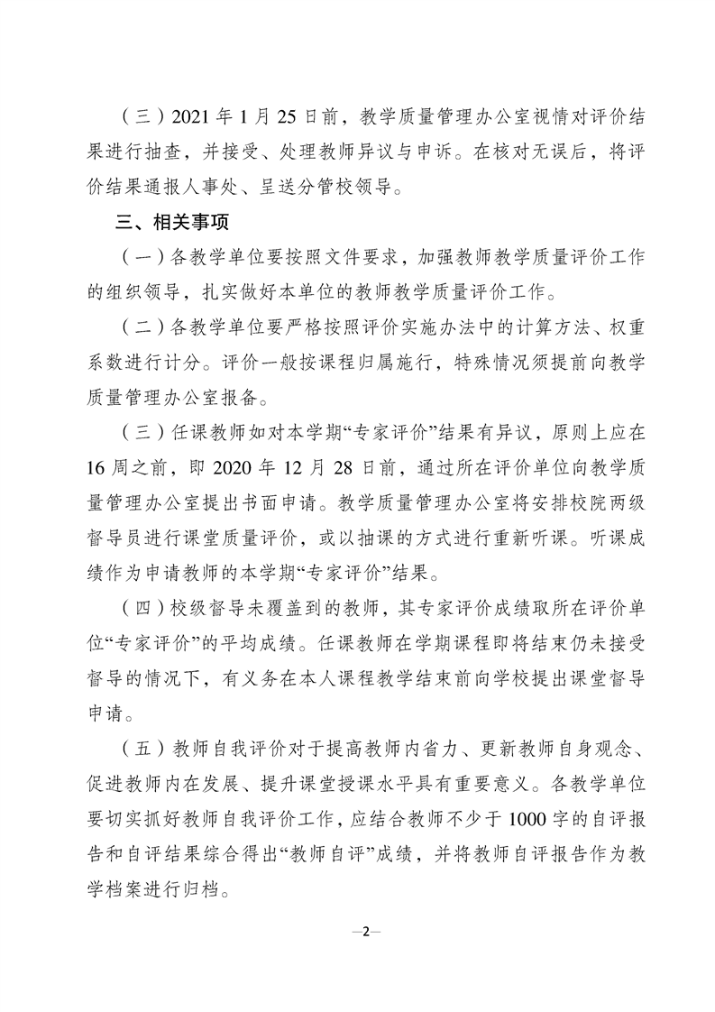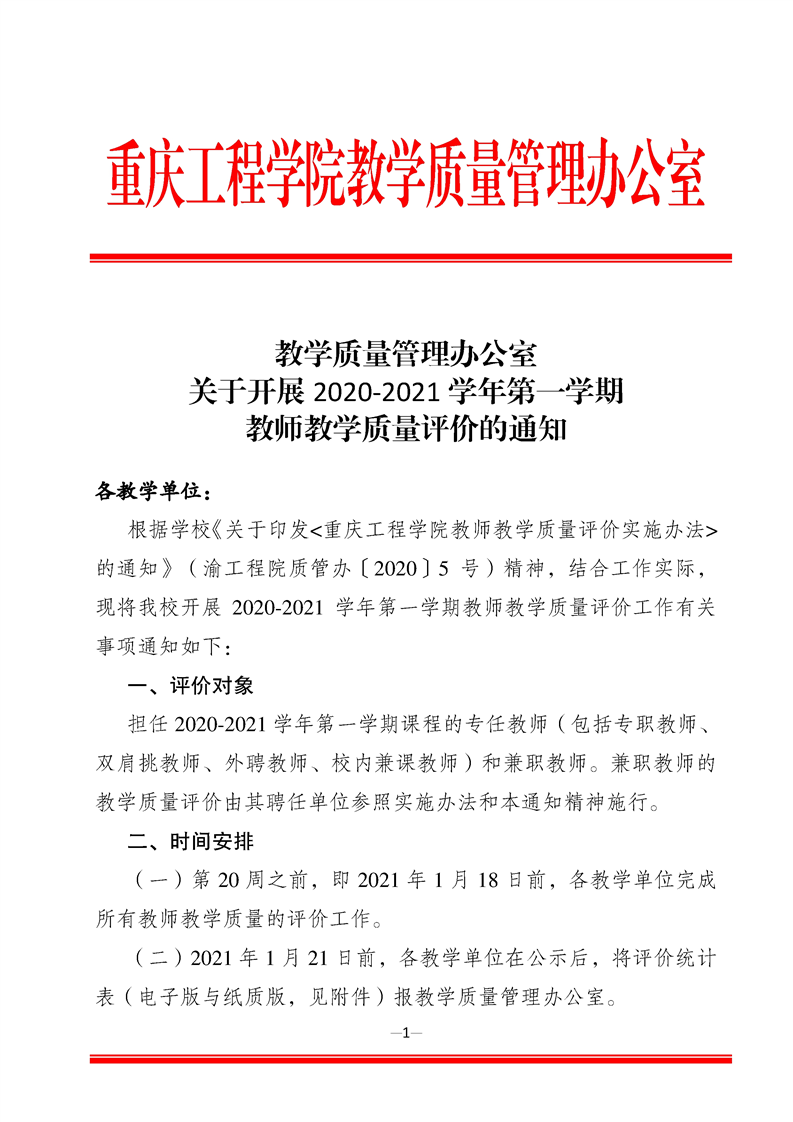 关于开展2020-2021学年第一学期教师教学质量评价的通知