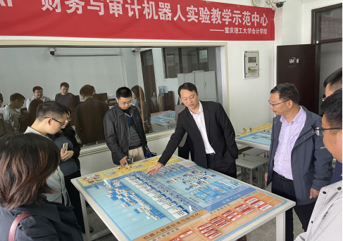 在重庆理工大学会计学院副院长程平教授的带领下,学院教师分别参观了工程训练与经管实验中心,包括财会仿真实验室、经济贸易仿真实验室、工商管理仿真训练室、广告设计创新实验室、物流仿真与模拟实验室等。