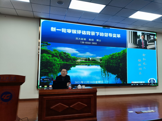 为提升教学督导水平,切实发挥教学督导在督管、督教、督学过程中的重要作用,12月10日下午,教学质量管理办公室组织召开2021年本科教学督导专题研讨交流会,会议邀请了西南大学教务处处长吴能表教授来校作报告。分管校领导,二级学院教学副院长,校、院两级教学督导,教务处、教学质量管理办公室相关人员参加了本次会议。会议由教学质量管理办公室赵钰主任主持。