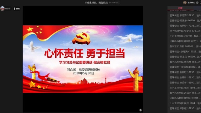 为提升毕业生党员的党性修养,在人生的新征途中,坚持正确的世界观、人生观、价值观和事业观,发挥毕业生党员走入社会后的模范带头作用,2020年毕业生党员专题培训班于2020年5月30日在线上开展,约230人参加。此次培训会由重庆工程学院党委组织部部长甘永诚同志主讲。