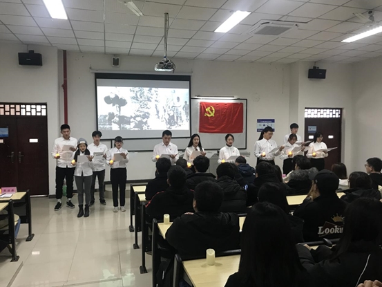 纪录片观看结束后,由学生党支部小组分别以诗朗诵、分享故事会等方式表达了自我思想与体会,激发了我们心中的爱国情怀,也增强了民族自尊、自信和自强精神。简单地介绍了南京大屠杀遇难同胞纪念馆后,预备党员及党员代表上台进行了发言,倡导每一名中国人都应牢记历史,以史为鉴,弘扬爱国主义,弘扬民族精神。最后,在王浩舟同志的带领下,全体同志起立,面向党旗庄严宣誓“勿忘国耻,砥砺前行”,并在纪念横幅上签字留念。