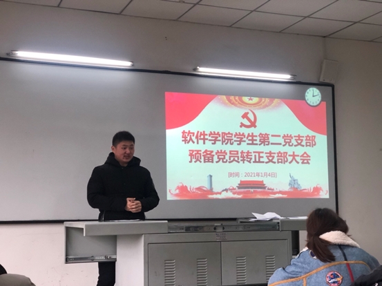 2021年1月4日12:00,软件学院学生第二党支部在6118教室举行了预备党员转正大会,一共54名支部成员参加本次会议。