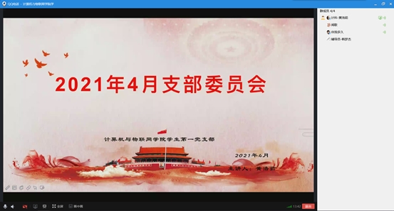 2021年4月25日计算机与物联网学院学生第一党支部召开了本月支部委员会,参加本次会议的是全体支部委员,分别是支部书记黄浩茹同志,组织委员韩梦杰同志,纪检委员陈炫堃同志以及宣传委员左莎莎同志。