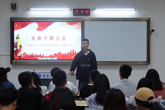 2021年5月5日晚大数据与人工智能学院学生党员实践教育中心在教学楼6101召开中心全体干部大会,参与此次会议的有组织委员张庆同志和学院学生党员实践教育中心全体干部。