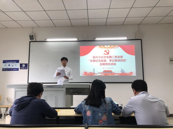 2021年5月26日晚,软件学院学生第二党支部在6120教室开展“分享红色故事、牢记革命历史”主题党日活动。学生第二党支部书记余巧、组织委员李霜,辅导员李阳、滕攀老师,以及学生第二党支部发展对象、预备党员参加此次党日活动。