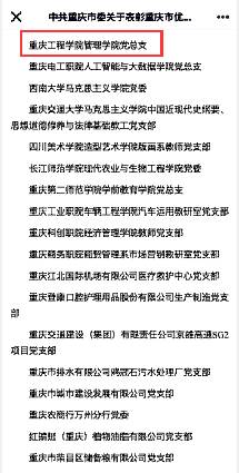 据重庆市政府网发布的《中共重庆市委关于表彰重庆市优秀共产党员、重庆市优秀党务工作者和重庆市先进基层党组织的决定》获悉,在庆祝中国共产党成立100周年之际,为表彰先进、弘扬正气,激励广大党员和各级党组织奋进新时代、展现新作为、铸就新辉煌,中共重庆市市委决定,授予万州区大周镇党委等300个基层党组织“重庆市先进基层党组织”称号,重庆工程学院管理学院党总支在列!这是继管理学院学生第一党支部2021年1月通过教育部首批全国党建样板支部验收后的又一殊荣。