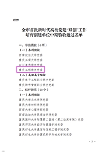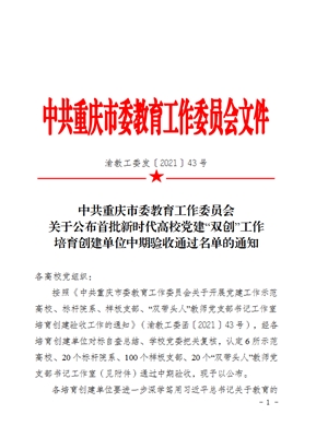 近日,中共重庆市委教育工作委员会下发《关于公布首批新时代高校党建“双创”工作培育创建单位中期验收通过名单的通知》(渝教工委发〔2021〕43号),重庆工程学院顺利通过“重庆市首批新时代高校党建‘双创’示范高校”中期验收,是重庆市唯一一所民办高校党建工作示范校。
