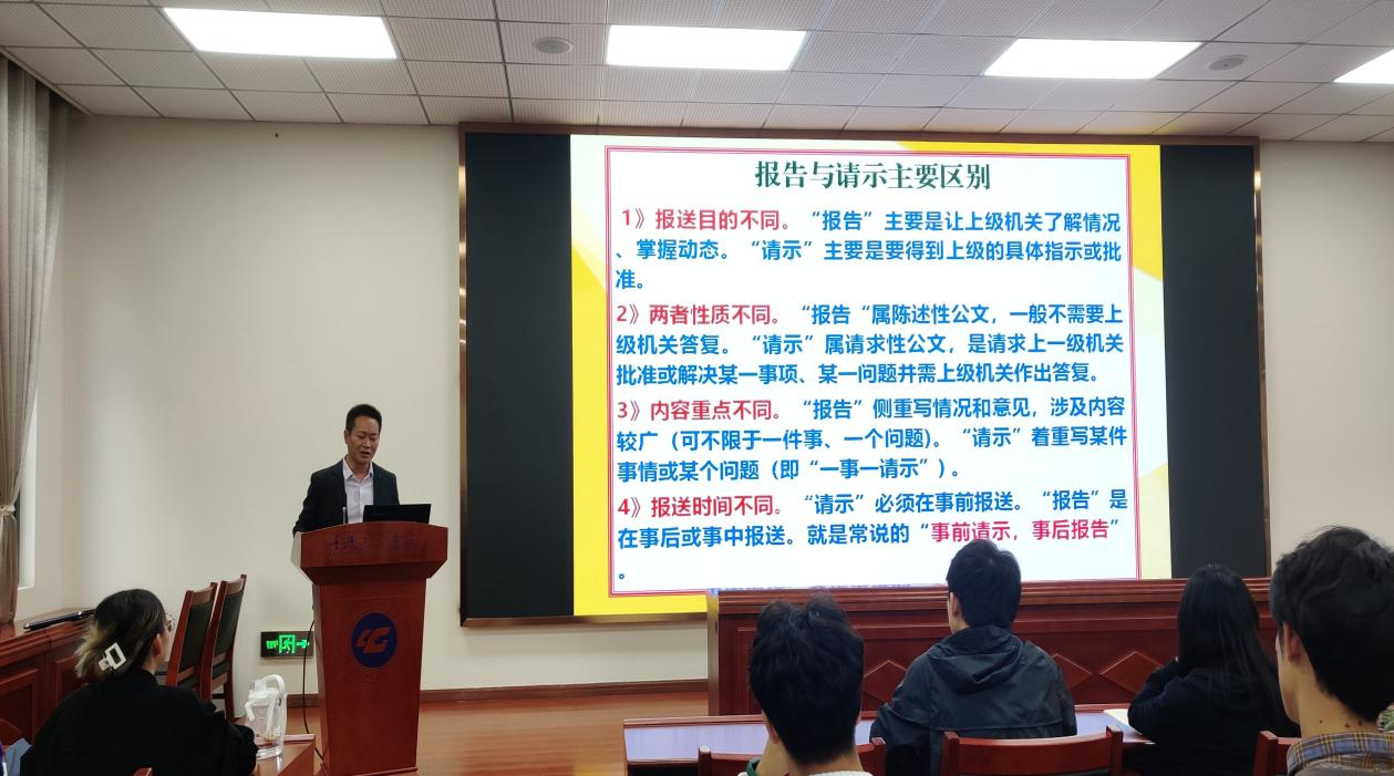 开班典礼结束后,学校党委统战部副部长、党政办副主任李义飞以“党政公文写作”为题,开始了本次培训的第一讲,他从公文种类、学校公文版头、学校发文代字规定、公文页面和字体要求、公文格式等七个方面展开了详细的讲解。在讲解过程中,李义飞老师着重强调了“党政机关公文写作常识”,在理论讲解的同时加入了实际案例,这不仅加深了干部们的理解,也极大的增强了中心全体干部的公文写作能力。