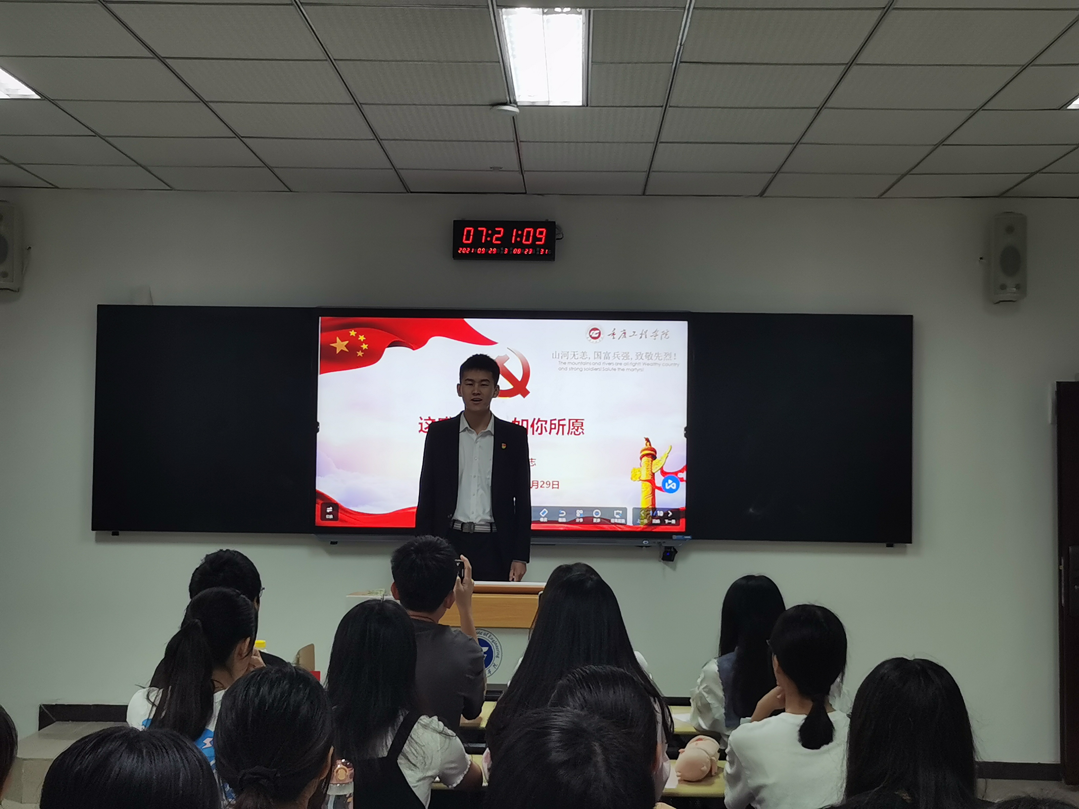 为庆祝伟大祖国72周年华诞,弘扬爱国主义精神和集体主义精神,讴歌社会主义的美好生活,展现重工学子的精神风貌,2021年9月29日,管理学院学生党支部在第六教学楼开展了以“盛世迎国庆”为主题的“大学生微党课”进班级活动。8位2019级预备党员走进晨课教室,为2020级同学们进行宣讲。
