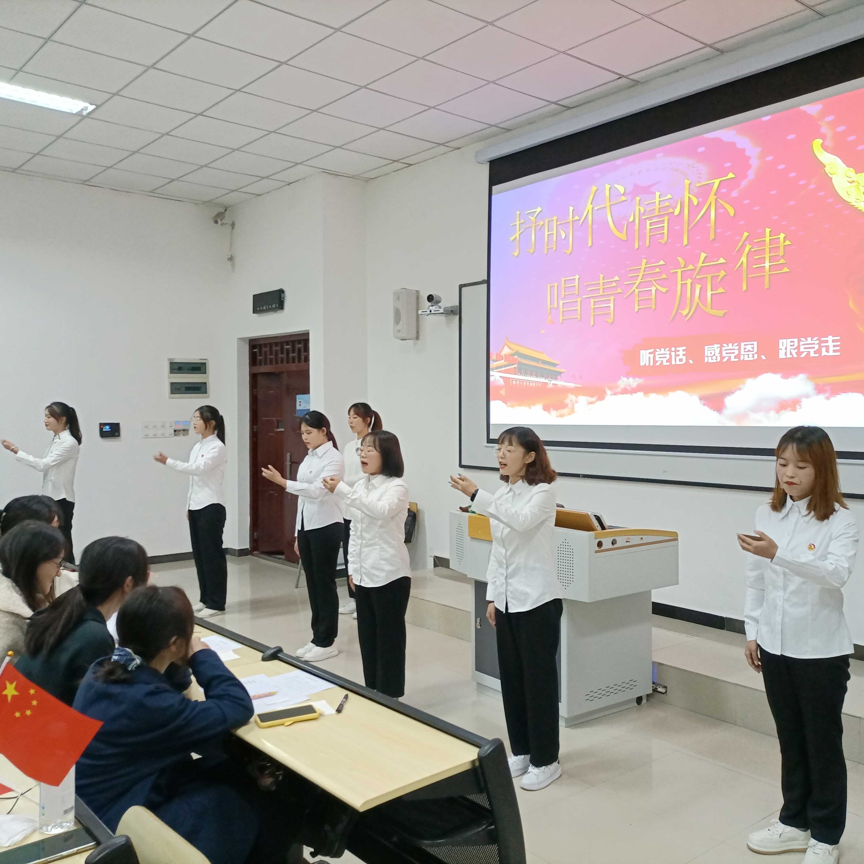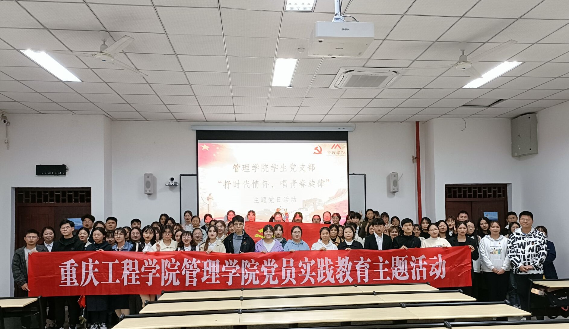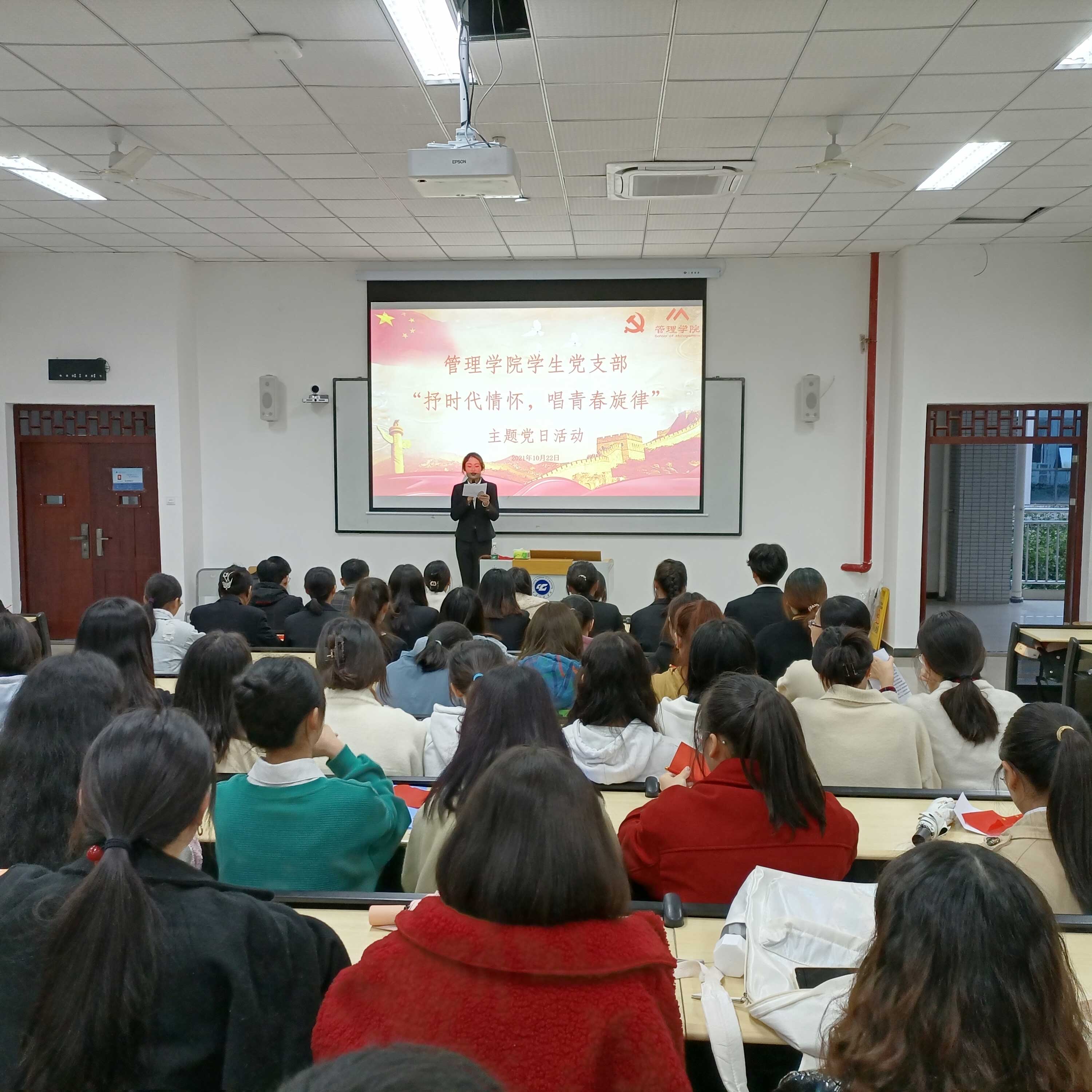礼赞新中国,讴歌新时代。为深入开展红色精神文化学习教育,加强广大青年学生的思想引领和价值导航,管理学院学生党支部于2021年10月22日在6204教室开展了“抒时代情怀,唱青春旋律”主题党日活动。此次活动由管理学院学生党员实践教育中心教育培训部干事陈邵珊主持,管理学院各学生党支部共有110余名同学参加。