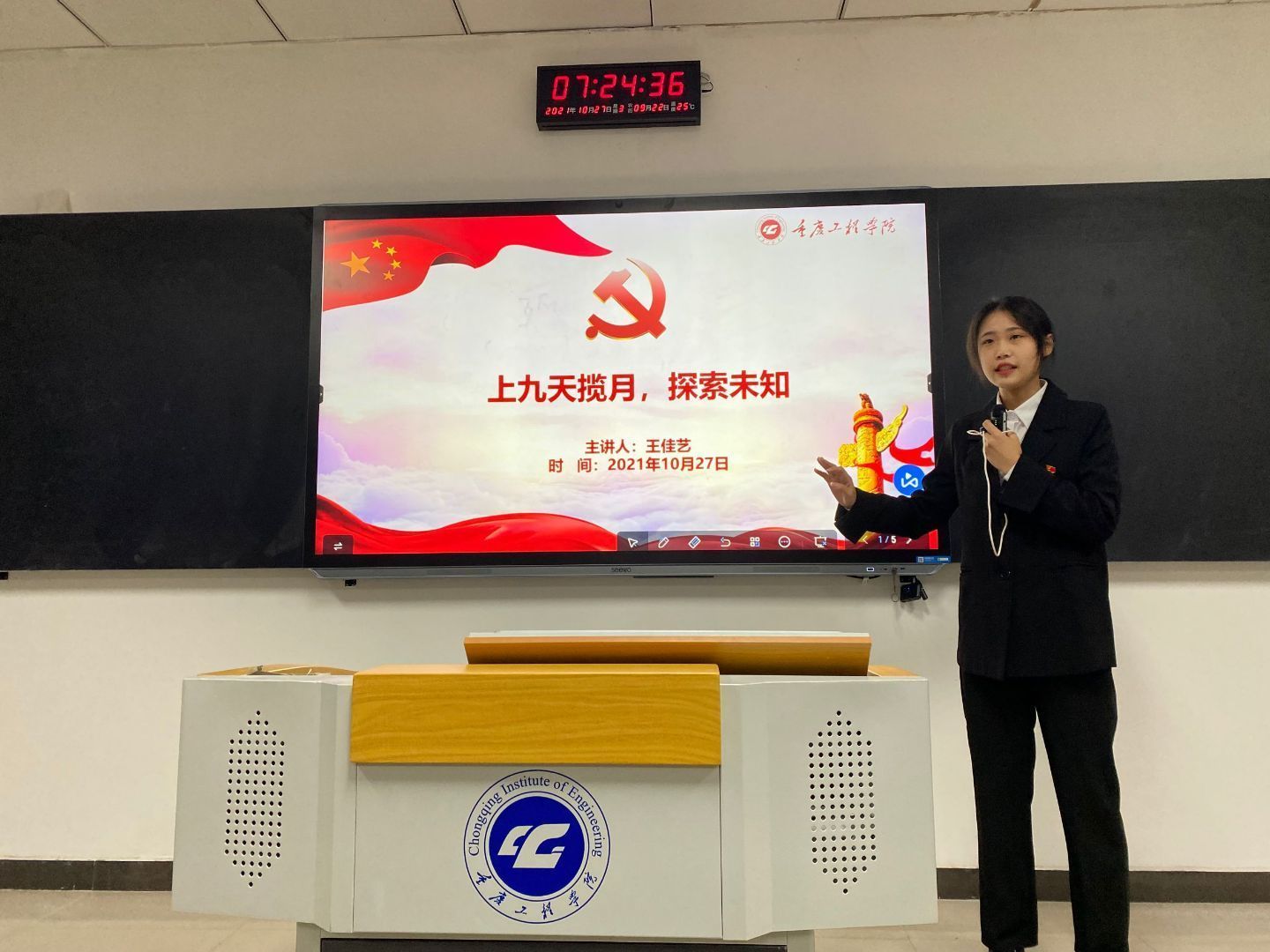为引导广大同学关注时事政治,心系党和国家的前途和命运,坚持正确的政治方向引领,2021年10月27日,管理学院学生党支部在第六教学楼开展了“大学生微党课”党员演讲进班级活动之时政热点。8名19级预备党员走进晨课课堂,以时政热点为主题,为20级同学们进行宣讲。